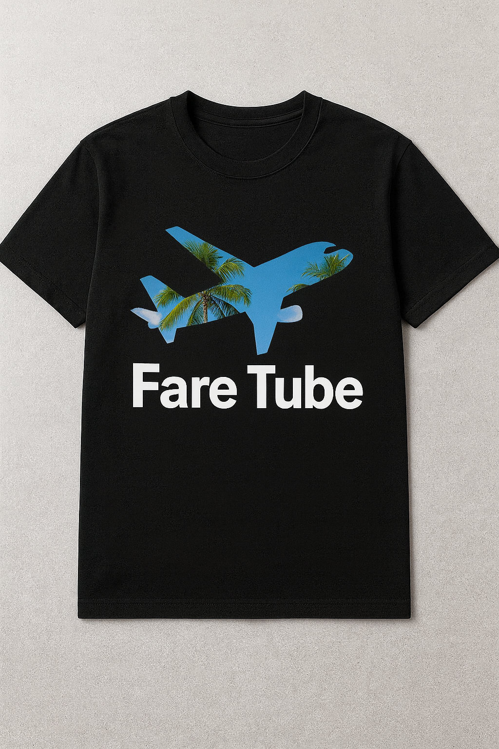 Show off your love for travel with this stylish Fare Tube Black T-Shirt, crafted from a soft and durable 50/50 cotton–polyester blend. The front features a bold airplane silhouette filled with a vibrant tropical scene—complete with blue skies, ocean hues, and palm trees—bringing vacation vibes to your everyday look.